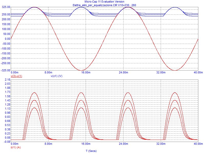beh ma mica ho parlato di continua, io semplicemente non mi spiegavo un ripple elevato su C1 e ovviamente è così grazie alla batteria in uscita, Vc1 può variare solo tra i 325V teorici massimi e i 230-260 della batteria.