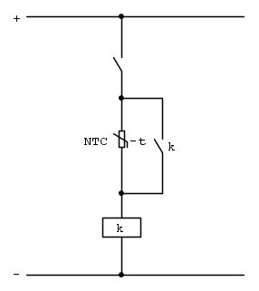 L’eccitazione della bobina di un contattore può essere convenientemente ritardata inserendo, in serie al circuito di comando, una resistenza NTC. Quando il tempo occorrente per il raffreddamento della resistenza è inferiore a tre minuti, si deve prevedere sul contattore un contatto ausiliario di chiusura che, a eccitazione avvenuta, ne realizzi il corto circuito, come dis.