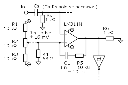 Aggiungerei inoltre un piccolo condensatore collegandolo tra l'ingresso invertente e il riferimento, calcolato in modo che non attenui e non sfasi percettibilmente il segnale in ingresso alla massima frequenza prevista. Dovrebbe servire a ridurre gli effetti indesiderati provocati dai picchi che potrebbero arrivare sull'ingresso invertente in prossimità dei fronti a causa della presenza di capacità parassite e accoppiamenti vari.