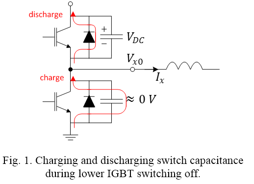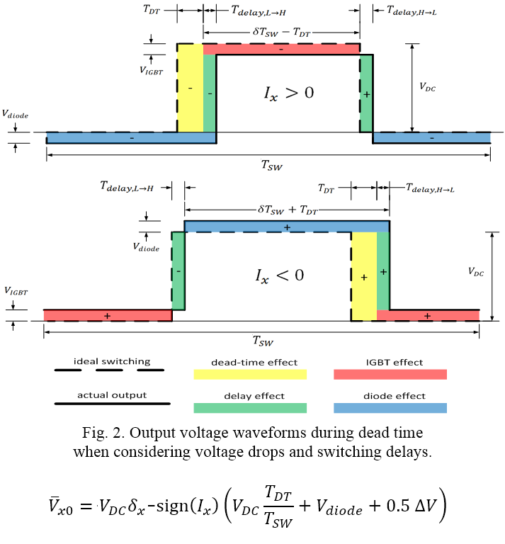 Con carico induttivo, in prima approssimazione si accende il diodo basso se la corrente è uscente dalla gamba, viceversa quello alto. Si avrebbe quindi una distorsione delle due tensioni di ramo (cioè le due uscite del ponte) pari ad una costante (Tdt/Tsw*Vdc) moltiplicata per il segno della corrente.