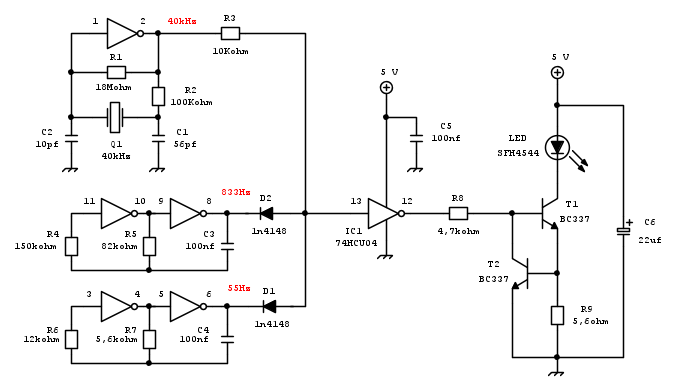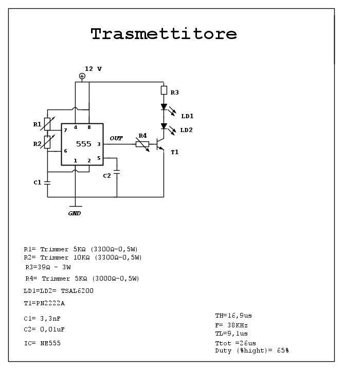 1.Nonostante l’uscita del NE555 mostra 38KHz circa tra sui led misuro 36KHz ho dovuto variare i trimmer 1 e 2 per ottenere i 38KHz sui led emettitori. La cosa non mi sorprende ma viste le specifiche dei led e del T1 non ci dovrebbe essere alcun impatto sulla frequenza di uscita.