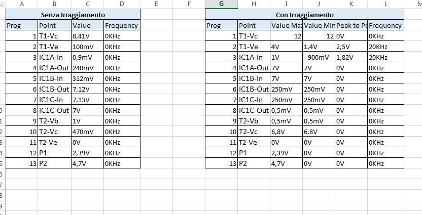 Ho dato una occhiata veloce ai dati e mi pare tutto in linea con l'atteso... è interessante notare che con irraggaimento dopo il primo stadio operazionale il circuito lavora in continua e questo conferma l'intuizione avuta di eliminare il famoso C2 all'uscita di IC1A. Analizzo i dati con lo schema alla mano e poi vediamo perche comincio a rovilgerre l'attenzione al trasmettitore per la limitata portata.
