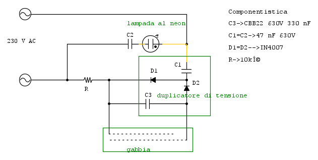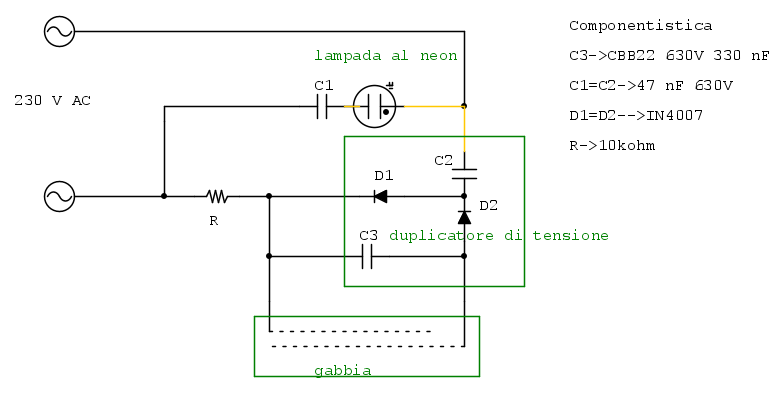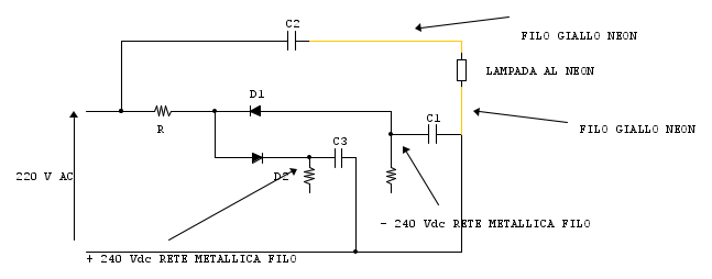 Allora per quanto riguarda il neutro tra le due reti che mi hai indicato, ti dico già che non ne ho la più pallida idea. A parte quei due fili volanti che vanno collegati ai due diodi non c'è ne sono altri. Forse si saranno spezzati o non so, quindi li ho indicati che vanno al neutro affinchè all'interno ricircoli corrente. Lo schema l'ho modificato come mi hai chiesto e ho inserito i componenti :