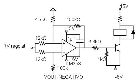 L'operazionale e` un LM358 o equivalente, alimentato fra il +15V e il -6V riferiti al positivo (in pratica l'uscita del ponte raddrizzatore dell'ausiliaria). Il ground che si vede nel circuito e` quello dell'elettronica, collegato al positivo dell'uscita.
