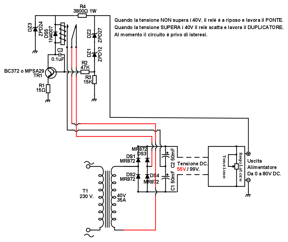 Ma… concludendo, ti voglio informare di un esperimento, sperando che tu non ci rimanga male (è soltanto un esperimento). L’altro giorno, mentre attendevo una tua risposta, mi sono messo a fare una modifica al giochino per la commutazione automatica e tutto sommato non mi è sembrata poi così male in termini di funzionamento. Certo, tecnologicamente immagino che la definirai un reperto archeologico però devo attestare che non sbaglia un colpo. Purtroppo non ha la funzione isteresi ma se aggiungessimo un trigger composto da un paio di transistorini magari potrebbe anche fregiarsi dell’isteresi. Inoltre non ha nessun problema di tensione alta o bassa, negativi o positivi, consumo o non consumo, funziona con la tensione di uscita e i transistor sono meno permalosi per la gestione delle tensioni di valore elevato. La pubblico, non si sa mai, è la seguente: