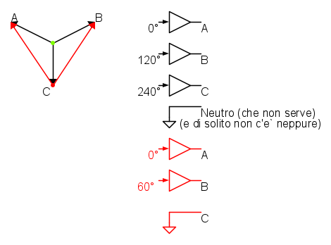 Se pero` si guarda la figura, per generare tre tensioni simmetriche rispetto al centro stella, si puo` anche dire che una fase, per esempio la C, e` collegata al potenziale di riferimento, e con due amplificatori si generano le tensioni A e B rispetto alla tensione C che e` a zero volt. In questo caso i due segnali devono essere sfasati di 60° e gli amplificatori devono poter generare una tensione picco picco di valore pari al doppio del picco della concatenata.