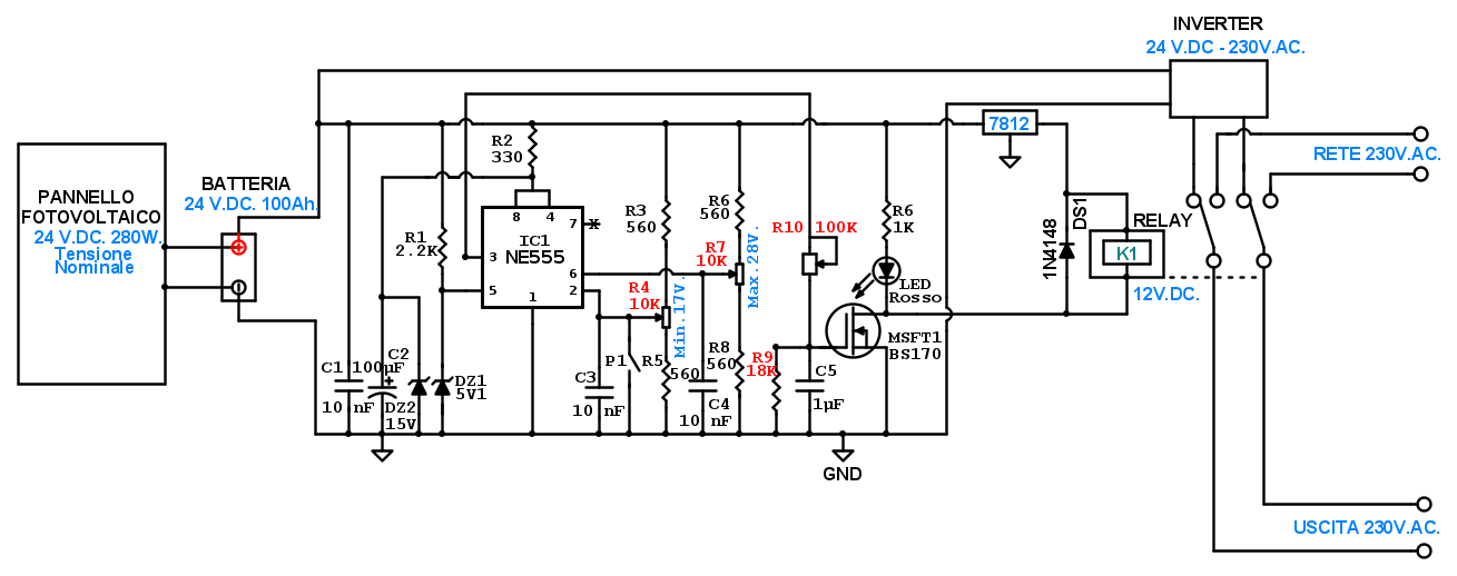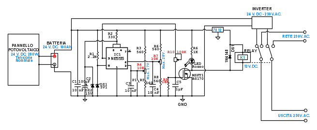 Le tensioni che appaiono di fianco ai trimmer R4 e R7 sono ipotetiche perché sarebbe da verificare se mentre il pannello fotovoltaico carica la batteria sarà in grado di arrivare ad erogare una tensione di 28V. Oltre al consumo residuo della batteria prossima alla carica completa, sarà da valutare anche il consumo passivo introdotto dal regolatore e dall’inverter a vuoto. L’inverter a vuoto consuma una correte di 0,5A.