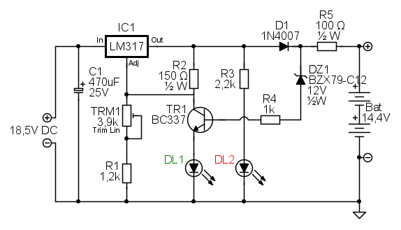 Oggi ho realizzato lo schema allegato (un po' anche per provare il suggerimento di Stefano) ma non sono riuscito a farlo funzionare come desideravo. Forse perché l'accensione di LED1 mediante TR1 non equivale a collegare al riferimento il pin ADJ di IC1, provocando lo spegnimento temporaneo del 317. In realtà, quando in uscita ci sono 14,4V, si verifica soltanto l'accensione del LED1 ma non l'interruzione della tensione di uscita che in ogni caso non va oltre i 14,5V. Infatti il LED2 non si spegne perché risulta alimentato.
