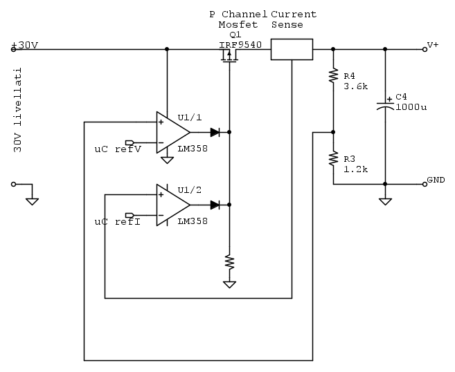 - Da uC modifico il rif di tensione per ottenere la tensione desiderata ma ACS+opamp+rif corrente wrk mi limitano la corrente a 2.5A massimo nel caso di corti se la corrente raggiunge i 3A la protezione voglio che stacchi tutto