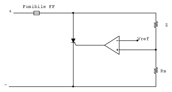 Il circuito proposto da Marco è un limitatore di corrente. In pratica se la corrente resta sotto la soglia prefissata l'alimentazione lavora in tensione costante, mentre quando si arriva alla corrente di soglia la corrente non va oltre. In pratica si lavora a corrente costante, per cui Q1 continua a dissipare tutta la potenza data da Imax* (Valim-Vload).