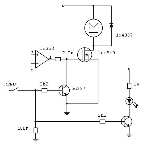 Ho spostato il 100K in modo da dare uno stato definito ai 2 BC337. Aggiunto secondo transistor per ridurre la corrente nel Reed.