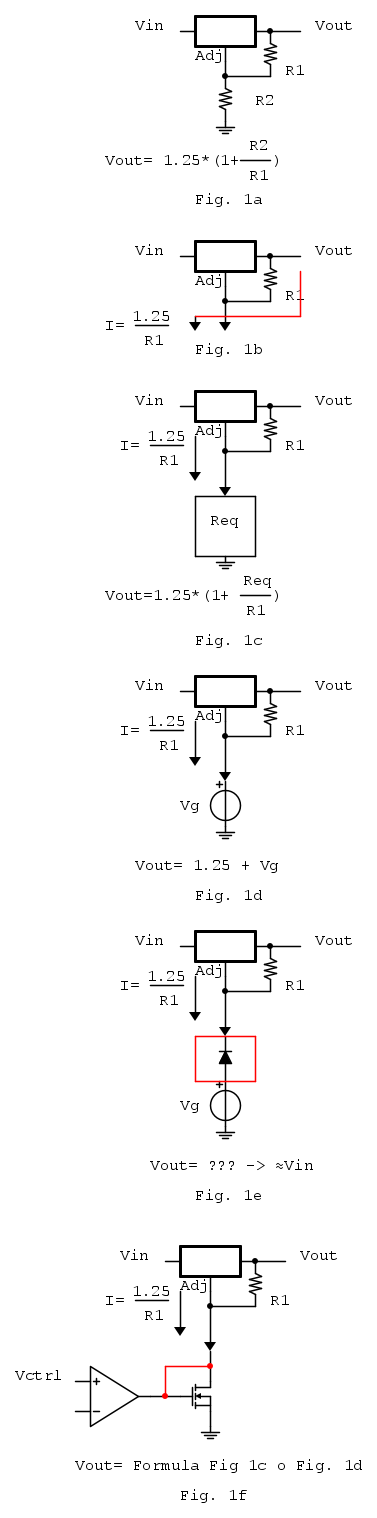 - trasformare la tensione di controllo in una resistenza dipendente dalla tensione di controllo (es. Mosfet) collegata tra il pin Adj e massa
