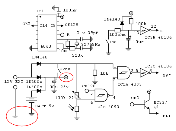 Nelle prime due foto si ha una vista globale del circuito. L'integrato in mezzo è il CD40106 mentre alla sinistra c'è il CD 4060 e alla destra CD4093.Per non sbagliare il 4093 è quello con il pulsante di over mentre il CD4060 è quello con il transistor nelle sue immediate vicinanze.