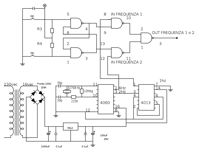 verra uno schema così...ma il pin 7 del 4011 va al negativo e il 14 vanno al positivo giusto? o li devo lasciare scollegati? e poi il condensatorino da 100nf? e le resistenze?