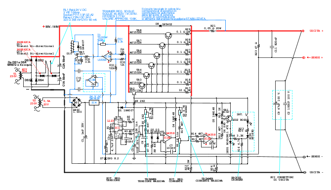 Occorre considerare che, se la resistenza totale dei due cavi principali di collegamento fosse, per esempio, di 1 Ω, ad un livello di corrente di 1 A, la caduta di tensione sarebbe di 1 V. Il circuito di remote sensing è stato riprodotto nello schema teorico in quanto facente parte dello schema originale di Elektor ma nell'impiego usuale è possibile renderlo inefficace. Potranno essere sistemati dei ponticelli di cortocircuito tra Uscita + con Sense + e Uscita – con Sense –, oppure eliminando direttamente le due boccole di sense, le resistenze R23, R24 e il condensatore C11, sostituendo le due resistenze con dei ponticelli da saldare al loro posto.