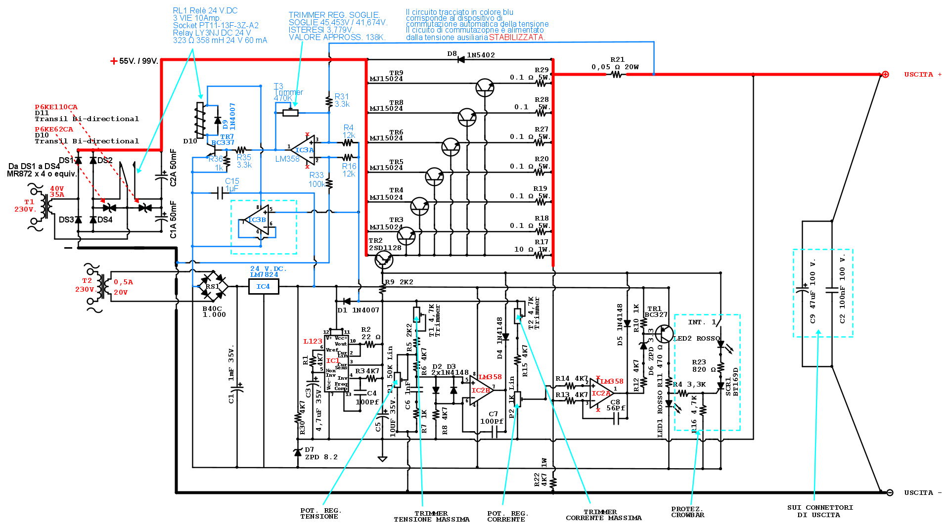 Ale (Elidur) questo schema non obbliga l’uso di un trafo da 1.000VA, funziona anche con tensioni e correnti più contenute o superiori. Basta introdurre qualche modifica e il giochino funziona sempre. Questa soluzione non l’ho trovata da nessuna parte in rete e la funzione che consente di ottenere una tensione di uscita doppia rispetto la tensione del trafo, senza dover commutare manualmente, la considero (personalmente) un tocco di classe. Con la tecnologia contemporanea capita raramente di aver bisogno di tensioni e correnti elevate eppure qualche volta mi è capitato di averne bisogno e capiterà ancora… Perché non te ne costruisci un esemplare anche tu? Ho quasi tutti i componenti per un altro alimentatore, poi, se non ti occorrono molti Ampere ho anche una buona disponibilità di trasformatori. Quanto al peso è vero ma tutto sommato è un dettaglio; In fin dei conti non devi andare a passeggio con l’alimentatore sotto braccio. Una volta piazzato su un supporto ci si dimentica anche del peso...