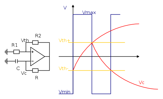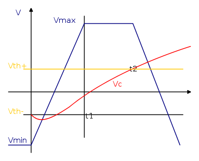 e` lo slew rate del segnale. Finita la fase di rampa, il condensatore si trova a una tensione Vc=V1 (da determinarsi) e deve ancora trascorrere un tempo t2 fino ad arrivare alla soglia superiore Vth+. Il tempo t1+t2 da` la durata di questo semiperiodo.