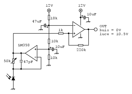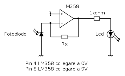 Si', una domanda: la tensione in uscita dal 358 (che va al led rosso) e' proporzionale all'intensita' della luce che colpisce il fotodiodo?