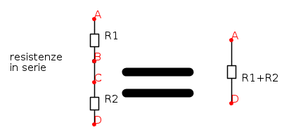 Nel caso specifico in cui due resistenze sono in serie, si può ridurle a un unica resistenza equivalente, nel senso che il resto del circuito non si accorgerà di questo cambio.