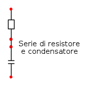 Per quanto visto prima notiamo che il condensatore e la resistenza a destra sono in serie tra loro, inoltre questa serie (condensatore+resistenza) è in parallelo con l'altra resistenza.