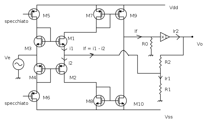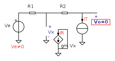 si puo` mandare a zero l'uscita. Il circuito di riferimento e` quindi questoLa corrente che circola in R2 e` IT, e dato che la tensione di uscita e` nulla la tensione Vx sara` pari a