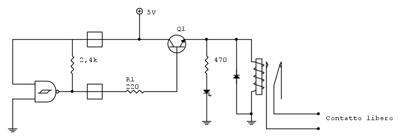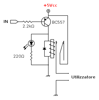 da quanto ho capito del componente che pilota "IN" (del quale però non ho trovato le specifiche), IN va da 4,5V a 0, quindi il circuito che hai postato non funzionerebbe perché il PNP sarebbe sempre acceso. Magari il relay si spegnerebbe, ma il LED di sicuro no, non del tutto almeno. Se invece tu hai trovato il datasheet e sai che IN raggiunge 5V, allora questo farebbe commutare il relay. Poi questo ha il relay spento per IN alto, acceso per IN basso, mi era parso di capire che volesse il contrario, e l'unico modo per avere un non-invertente a uno stadio e prelevare l'uscita dall'emettitore.