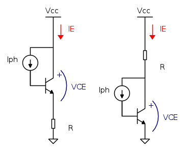 In realtà non mi pare che il bipolo CE del transistor veda nessuna differenza nell'essere "sopra" o "sotto"..