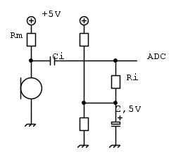 Dopo il condensatore ci vuole una resistenza "Ri" (il cui valore determina l'impedenza d'ingresso vista dal microfono e costituisce il filtro passa alto insieme al condensatore "Ci") che va ad una tensione di riferimento (pari a Vcc/2 = 2,5V e questa deve essere precisa) ottenuta con un partitore