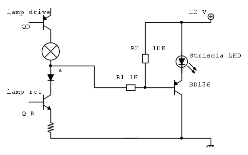 Quando anche QR è chiuso (assieme a QD da combinazione della matrice), nel punto " a " si trova un livello basso e a questo punto il BD136 si chiude, alimentando la striscia a led.