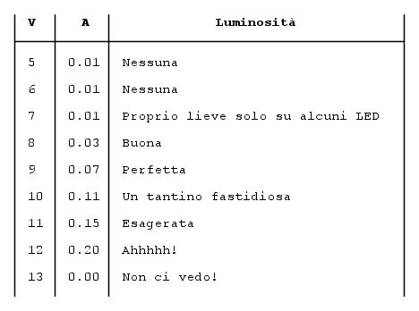 Ho comunque fatto alcune prove con l'alimentatore stabilizzato e ottenuto questi dati:
