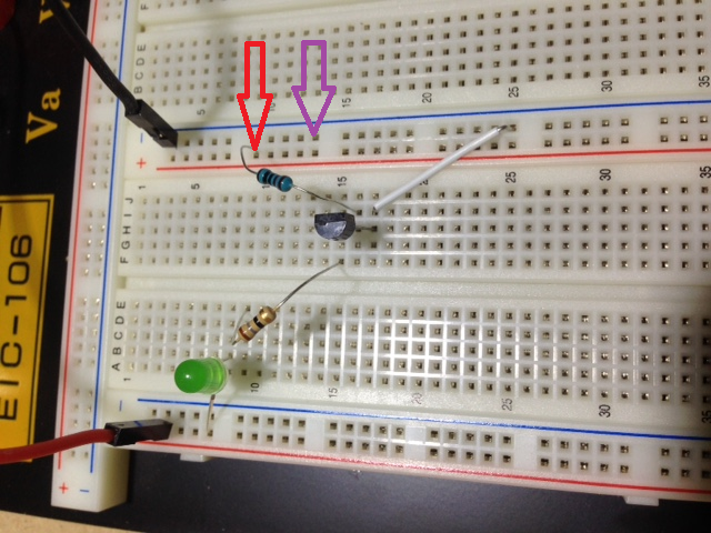 Prova a spostare il terminale della resistenza segnato dalla freccia rossa nel pin della bread board segnato dalla freccia viola ;-)