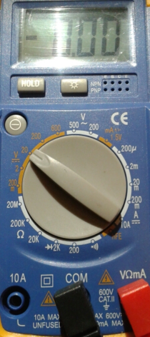 Con il tester cosi' settato cerchi di misurare una tensione continua che non c'e'; da un tasformatore esce tensione alternata, quindi per rilevare la misura devi metterlo su 500 o 200 (tre/quattro tacche a destra).
