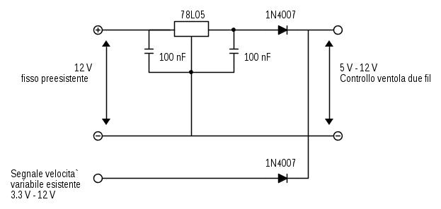 ...oppure, sempre della serie "non complichiamoci la vita per una ventola", se sono disponibili 12V con corrente sufficiente alla ventola, si potrebbe fare così: