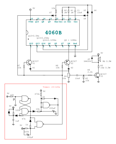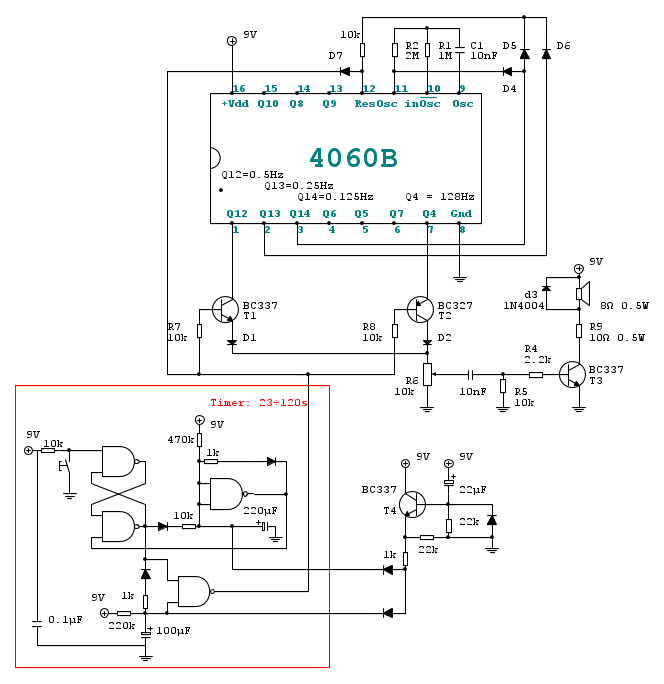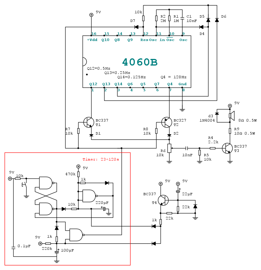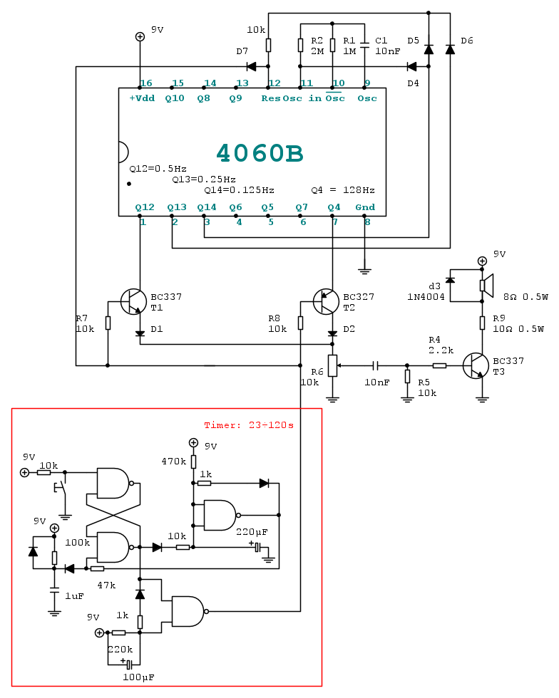 2) Le uscite (2) Q13 e (3) Q14, quando vanno alte, resettano il 4060 attraverso D5 e D6 ma quando l'uscita del timer è bassa l'ingresso (12) di reset è forzato basso attraverso D7, quindi il reset non può avvenire, perciò il conteggio progredisce fino a quando Q14 va alta, poi si blocca l'oscillatore attraverso D4, quindi quando il circuito è a riposo si trova in queste condizioni e nessun suono viene emesso perché l'oscillatore è bloccato e il conteggio congelato.