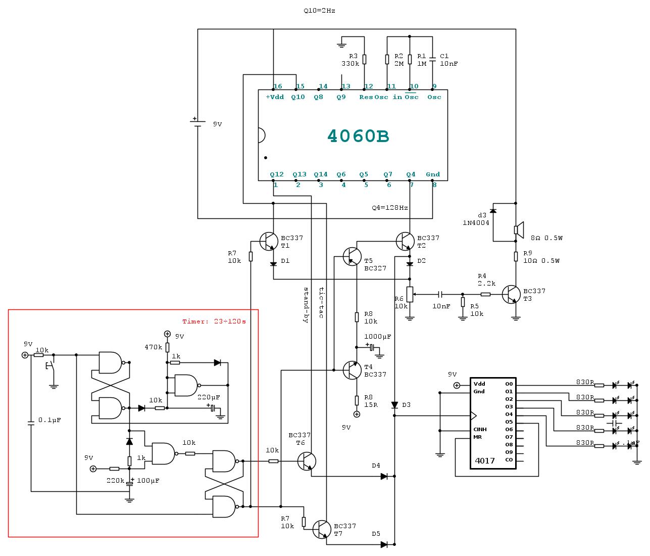 Al termine del tempo, quando l'uscita del timer va bassa, forza di nuovo a livello basso l'ingresso di reset del 4060 evitando che il reset possa avvenire e dando modo al conteggio di proseguire per un tempo che può andare da 4 a 6 secondi fino a che l'uscita Q14 blocca di nuovo l'oscillatore.