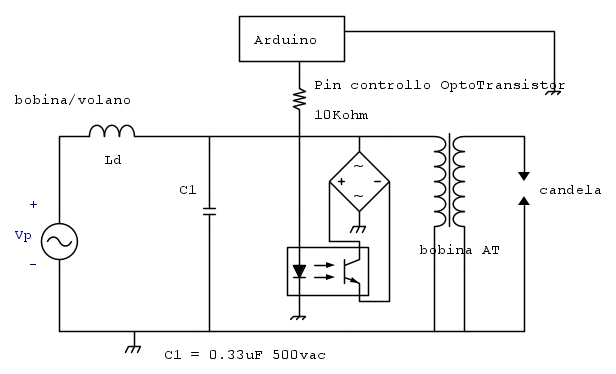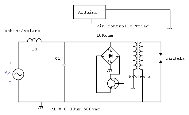 Si e no, così (almeno concettualmente) funzionerebbe, bisogna tener conto del fatto che le puntine si aprono quando il magnete interessa la bobina volano con il massimo flusso (o nell'intorno) e questo ad ogni giro dell'albero. In quel momento, la tensione potrebbe essere negativa o positiva (rispetto alla massa) e per questo abbiamo messo il ponte raddrizzatore, tuttavia nella pratica reale si preferisce ricorrere ad altro sistema detto CDI o accensione a scarica capacitiva, sotto uno schema trovato in rete.