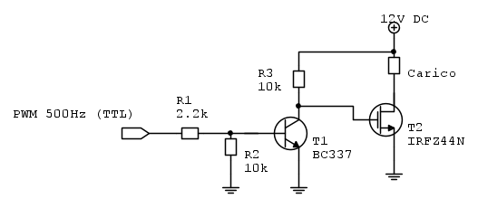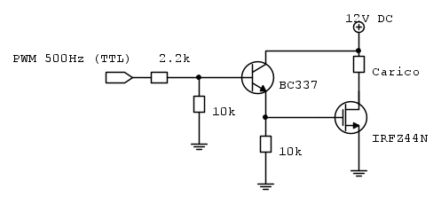 Carico da 12V anche lui, quindi nessuna resistenza di limitazione o limitazioni nel PWM: duty cycle completo da 0 a 100%.