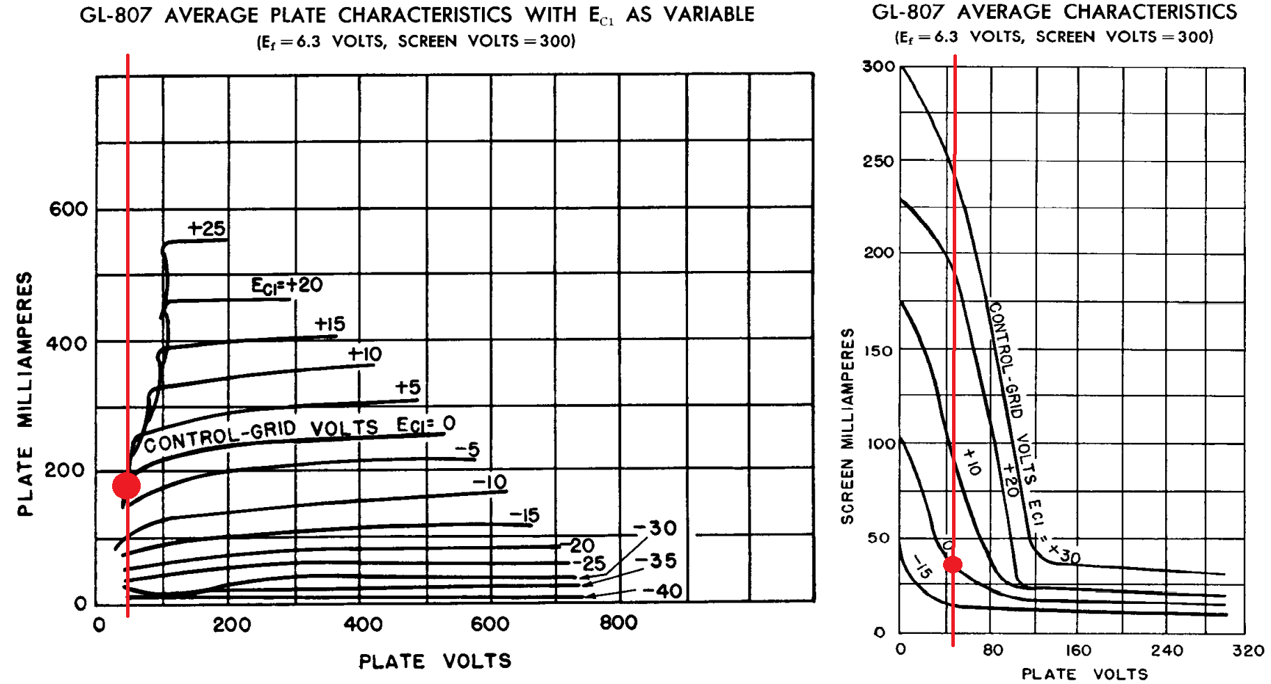 Puoi fare riferimento alle curve di pag.4 del datasheet che ti ho linkato e che ho riportato di seguito, dove le righe rosse intercettano i punti sulle curve con la tua polarizzazione della placca di circa 50V e dove il punto rosso si riferisce alla polarizzazione della griglia controllo a 0V, però entrambi i grafici si riferiscono ad una tensione di griglia schermo di 300V, quindi credo che i bassi valori che hai rilevato siano causati dalla bassa tensione di soli 50V con cui hai polarizzato la griglia schermo.