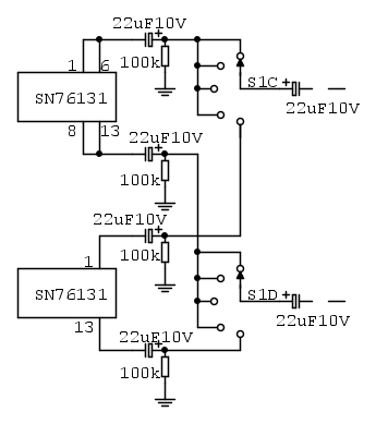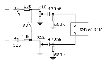 Con questa modifica però, quando il selettore stereo/mono S3 è impostato su "mono" e contemporaneamente il selettore dei toni S1A-S1B è impostato su "toni esclusi", succede che l'impedenza vista a valle dei selettori S1C e S1D si abbassa da 100k a 20k, vuol dire che il valore di 1uF del condensatore discusso ieri da aggiungere a monte dei selettori S1C e S1D è insufficiente e andrebbe portato a 22uF .