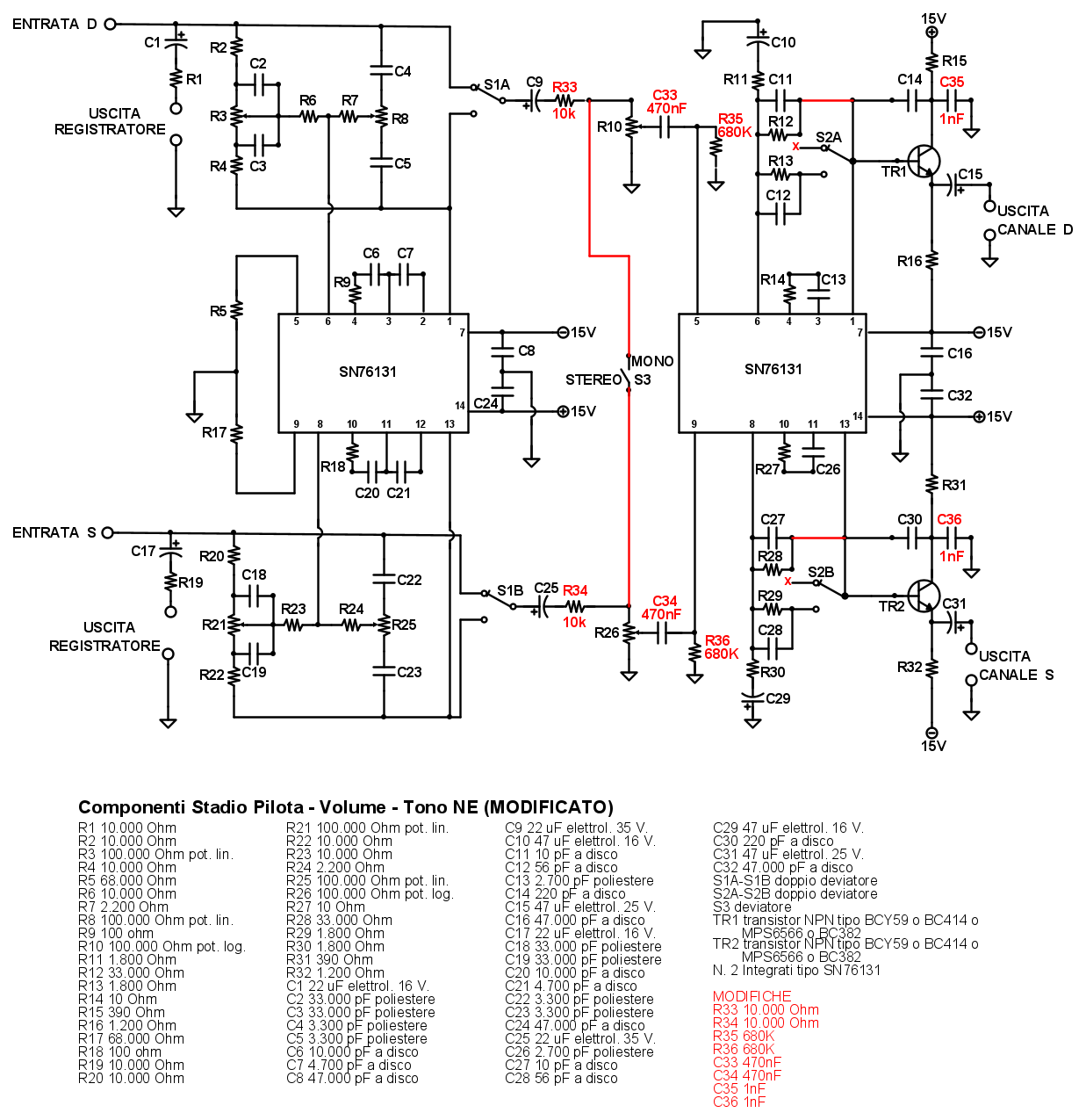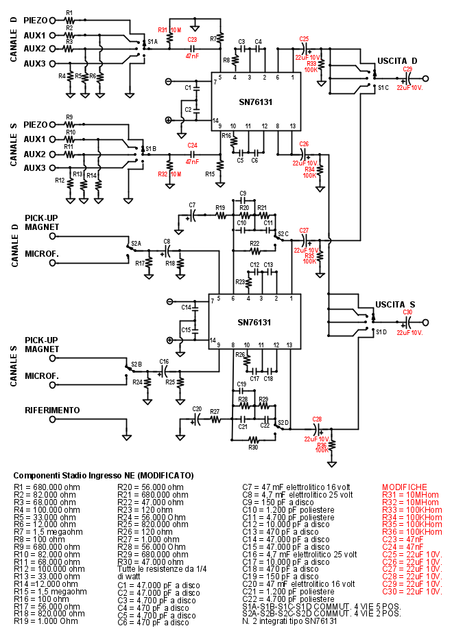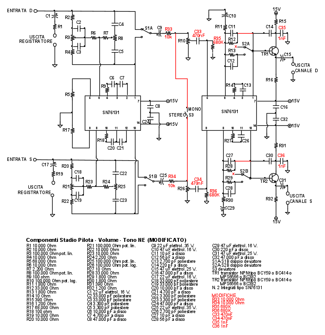 Inoltre aggiungerei un altro condensatore da 22uF a valle dei selettori S1C-S1D per evitare che la corrente di ingresso dello stadio controllo toni possa spostare il potenziale sulle R da 100k che invece deve rimanere nullo.