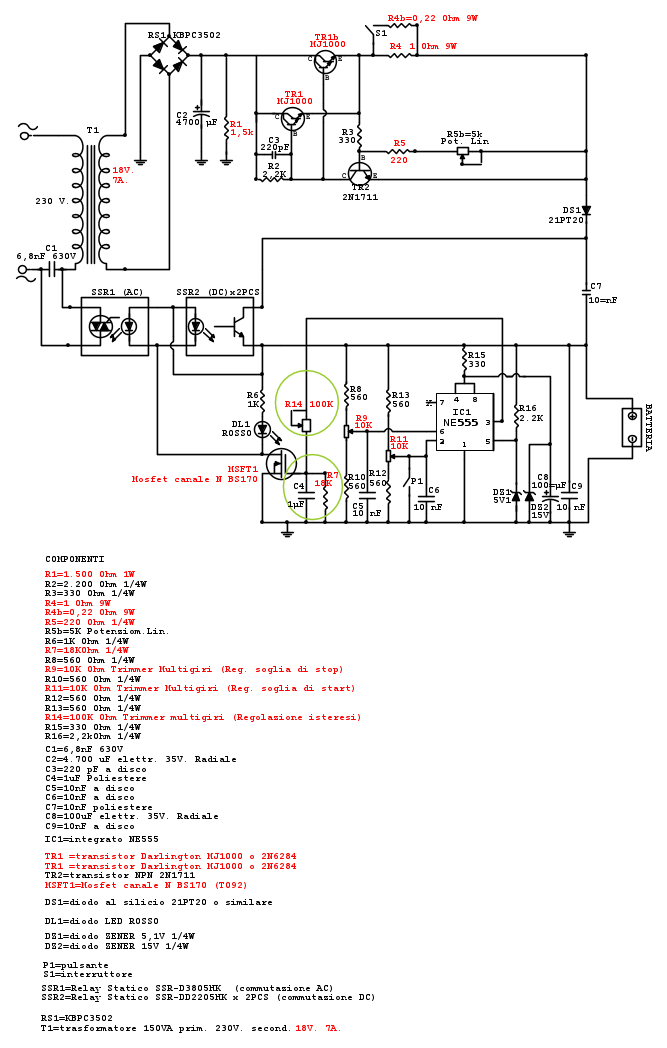 5) Ho sostituito la resistenza R14 con un trimmer multigiri da 100k Ohm in quanto tale resistore concorre per la gestione dell’isteresi. L’isteresi, lo ricordo per chi non avesse letto tutta la discussione, è utile in caso di distacco voluto o accidentale delle pinze dalla batteria durante la carica, evitando, così, che si inneschi una commutazione ciclica degli SSR per via del raggiungimento della soglia minima e massima dovuta alla carica e scarica dei condensatori. Scollegando le pinze e grazie all'isteresi, s’interrompe il funzionamento del circuito fino al ripristino delle predette pinze sui poli della batteria, impedendo, appunto, che gli SSR si attivino e si disattivino "all'infinito". La resistenza a valore fisso (R14) precedentemente adottata, non rendeva affidabile la funzione dell’isteresi con i valori di soglia (predeterminati) a causa delle tolleranze intrinseche dei componenti. L’inserimento del trimmer, invece (dopo aver regolato le soglie di intervento per lo start & stop) ha reso possibile, “sintonizzare” il partitore RC dell’isteresi nella zona d’influenza preferita dall'utente per le predette soglie, annullando così il problema delle tolleranze.