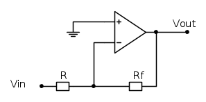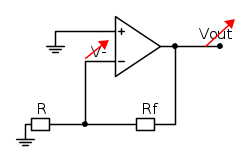 V_{out} = A_{opamp} ((V+) - (V-)) = -\frac{R_f}{R+R_f}