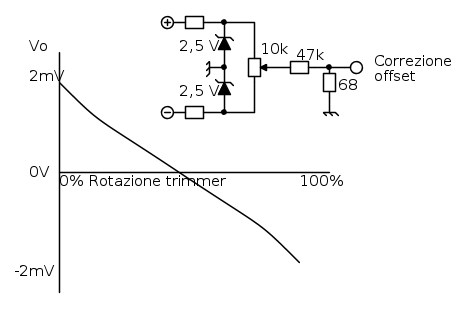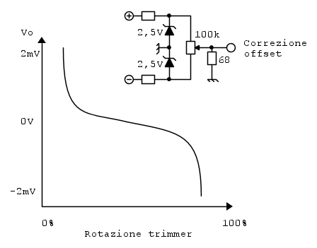 Ad ogni modo, con lo schema suggerito e con le alimentazioni a ±12 V, avrei avuto un campo di tensioni di ±1,5 mV, quindi circa 0,12 mV/giro con un trimmer multigiri, mentre col mio circuito, nella regione lineare ho circa 0,35 mV/giro. Oltre ad aver complicato le cose, le ho peggiorate! :mrgreen: