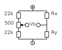 • tenendo fisso R_x, ho trovato due resistori R_y identici (che fornissero la stessa tensione di sbilanciamento), e li ho usati per bilanciare di nuovo il ponte: a questo punto, so che il ponte è bilanciato quando R_x = R_y;