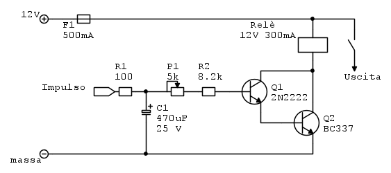Tramite il potenziometro P1 aggiusti il tempo di accensione, che dipende anche dalla corrente minima di mantenimento del relè che userai.