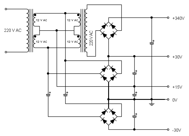 Osserva i due ponti, quello centrale e quello in basso, in ingresso ad entrambi è applicata la stessa tensione alternata di 24 V, i due condensatori in ingresso al ponte in basso sono trasparenti per l'alternata, quindi, se in in ingresso ad entrambi c'è la stessa tensione vuol dire che anche in uscita c'è la stessa tensione, cioè 30Vdc in entrambi.