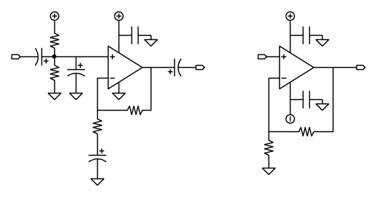 In realtà ho omesso in entrambi un condensatore; un condensatore che va messo in parallelo al resistore di feedback per realizzare un filtro passa basso allo scopo di limitare il guadagno dello stadio in alta frequenza (autooscillazioni sempre in agguato... ).