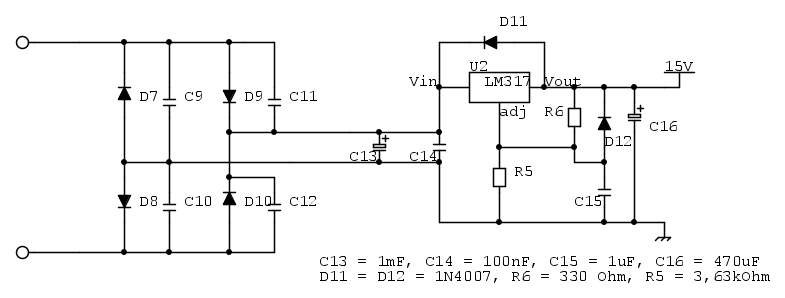 Pensavo di farlo, sempre con un ponte diodi, i condensatori di livellamento (uno, 1000uF), un condensatore di bypass da 100nF e poi un LM317