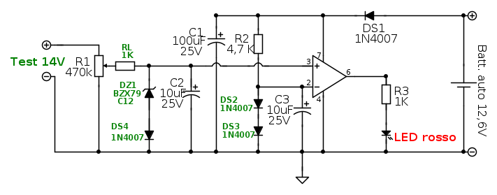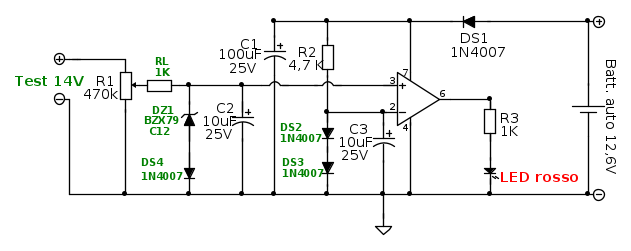 DS4 serve ad elevare un po' la tensione di Zener portandola a 12,5V. in modo che la tensione ammissibile alla porta non invertente dell'operazionale sia il più possibile vicina al valore della tensione nominale della batteria ma senza superarlo.