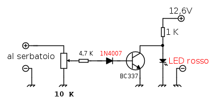 Ribadisco che le prove fatte hanno confermato che con il valore del potenziometro utilizzato si riesce a far accendere o spegnere il led entro un range di tensione d'ingresso al potenziometro che va da 1,2V a 14V ma sarebbe da provare su un veicolo. Purtroppo non so se siano note le variazioni di tensione determinate dal potenziometro realmente abbinato al galleggiante e non è noto il valore del predetto potenziometro e se sia di tipo lineare o logaritmico. Personalmente non ho la necessità di applicare ad un veicolo il circuito in prova poiché gli esperimenti al banco li ho realizzati solo per curiosità. La prova pratica, quindi e se il circuito fosse ritenuto utile, dovrà essere fatta dall'Utente interessato.